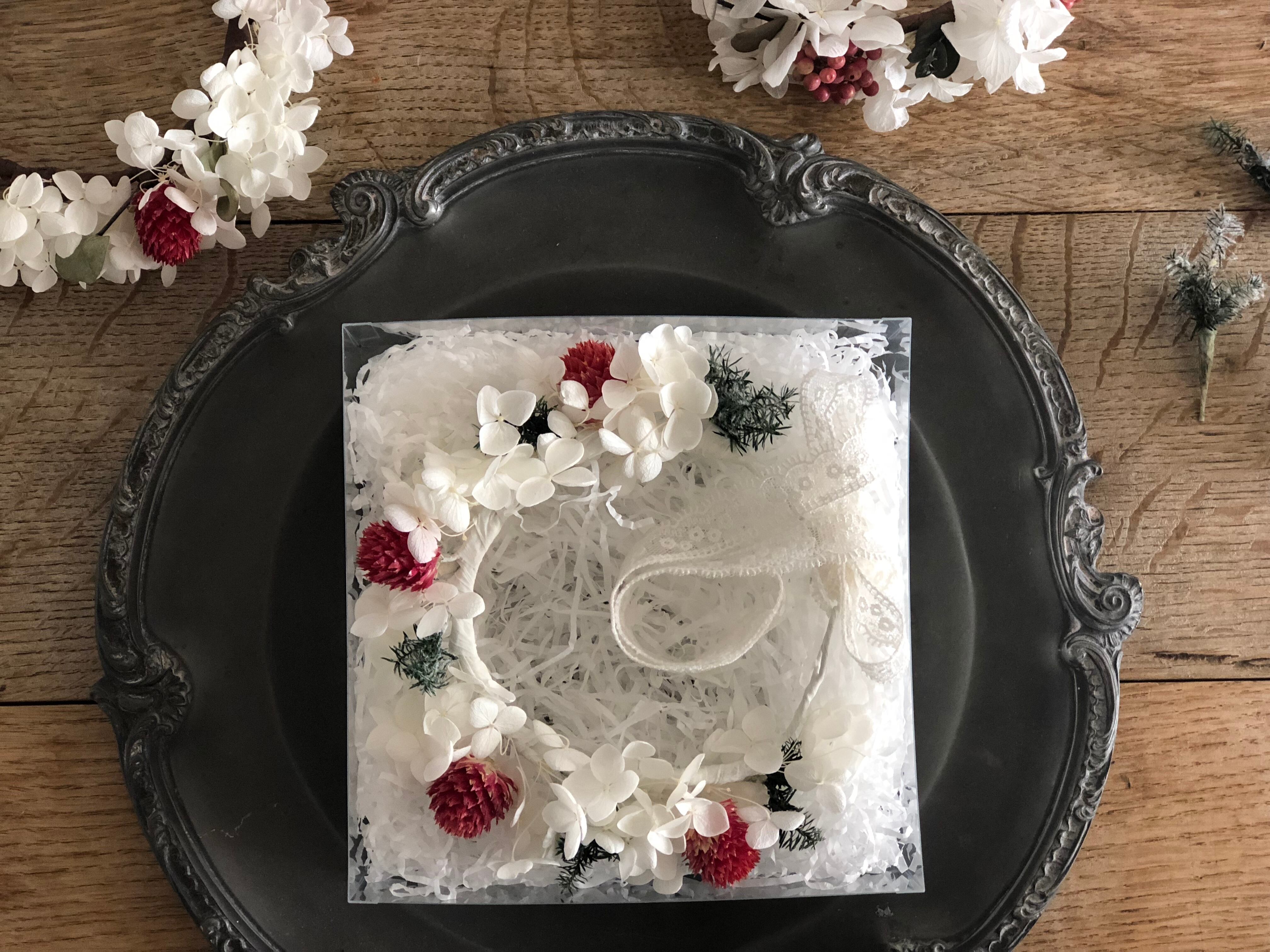 プリザーブドの真っ白なあじさいと、雪化粧したヒロムスギ、ドライの千日紅のわんこ花冠です