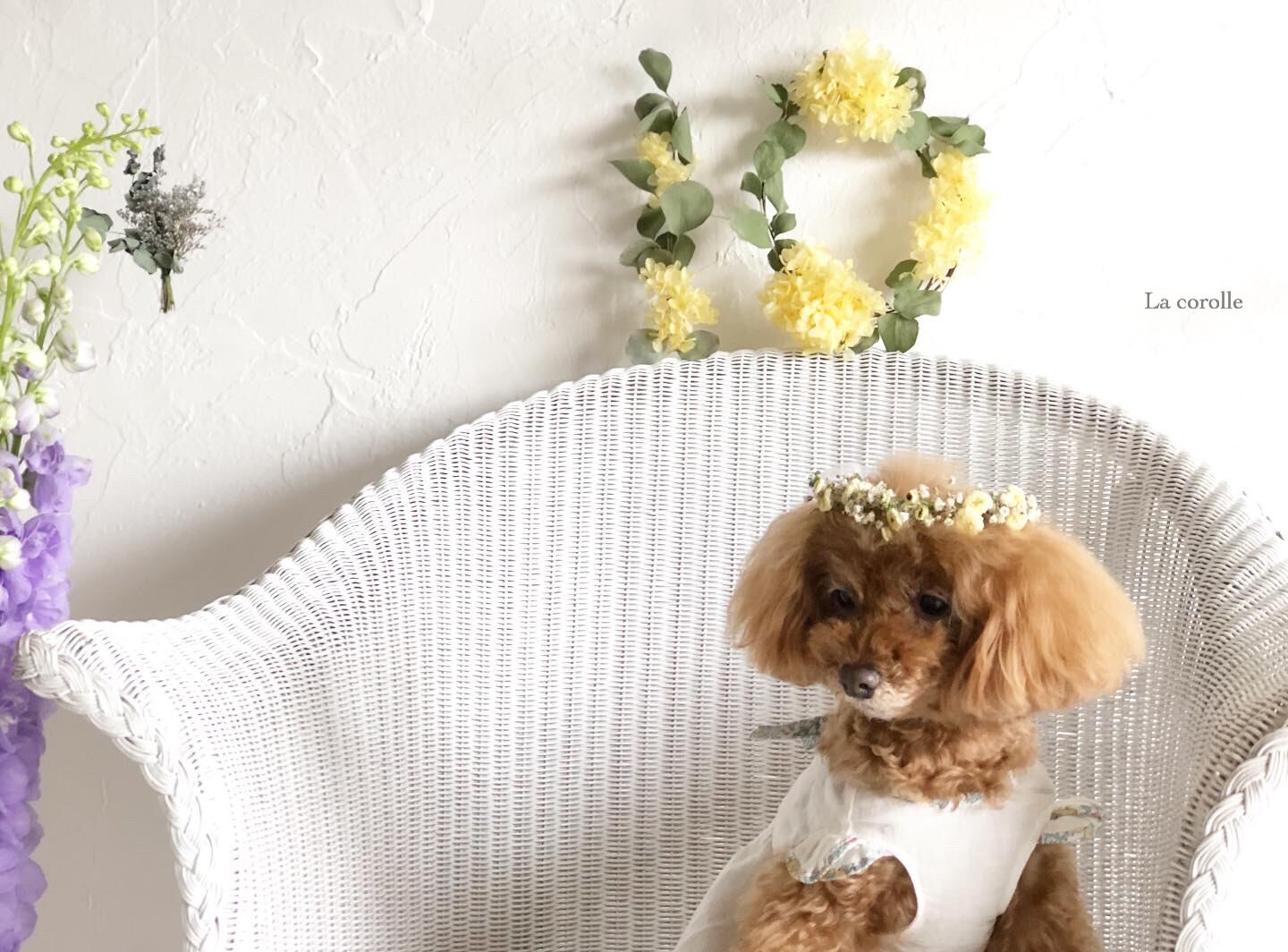 かすみ草とマトリカリア・ピュアホワイトのドライフラワーで創るDog corollaです